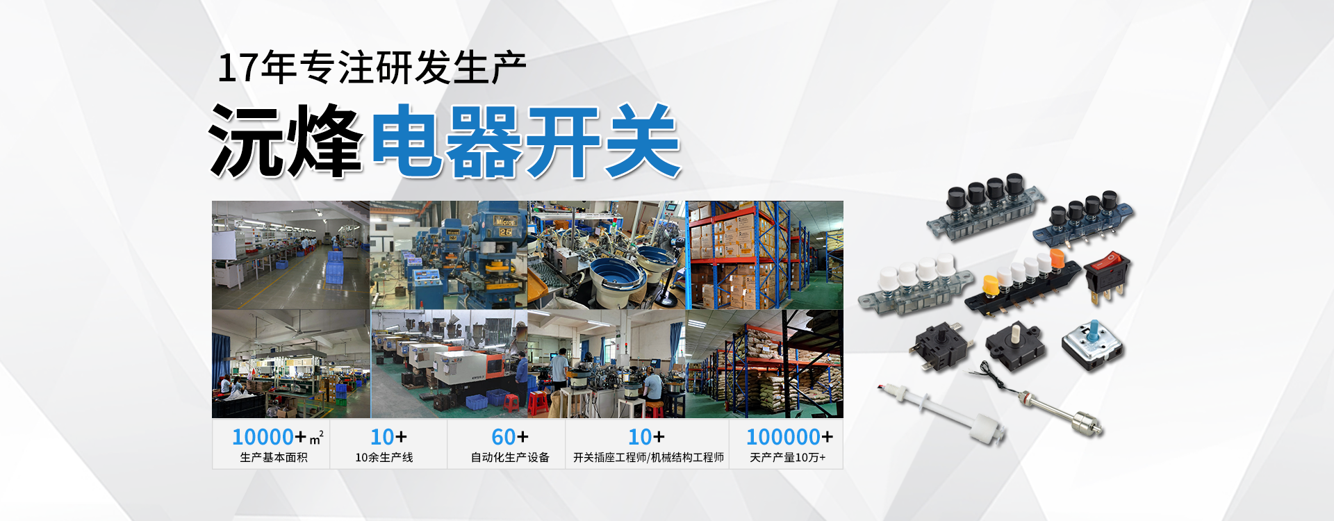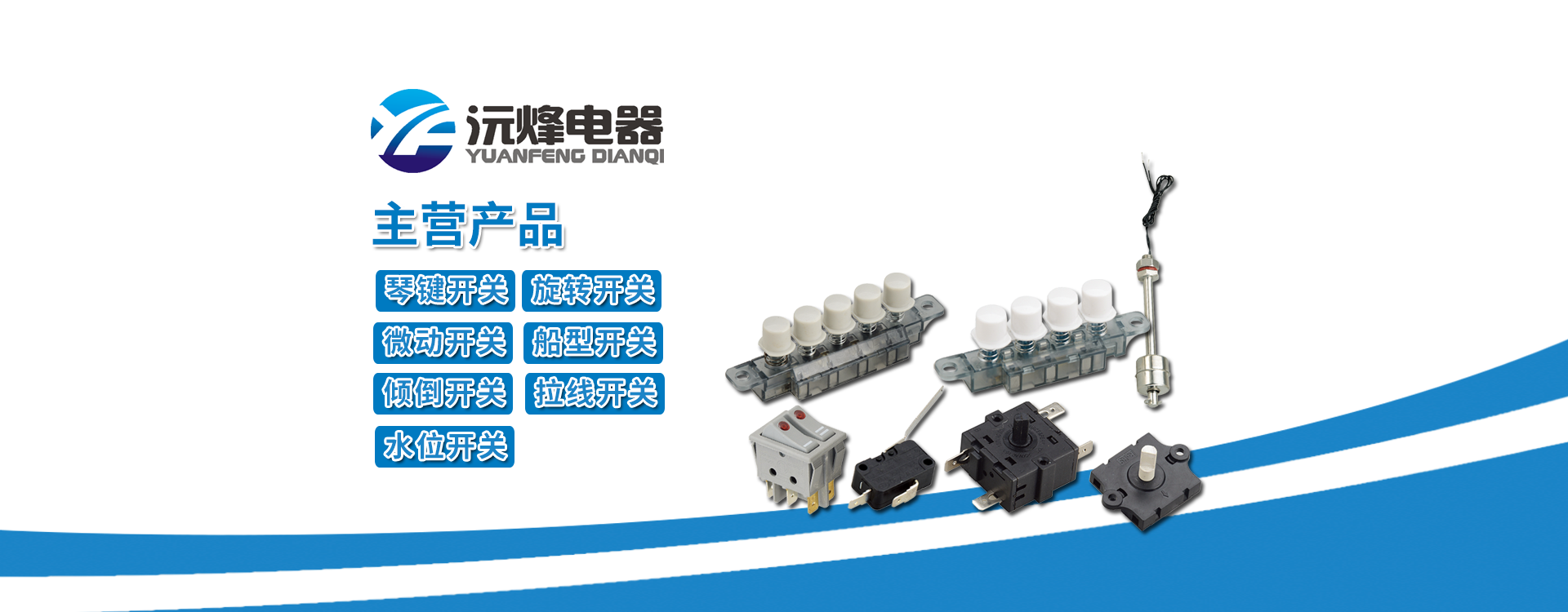主要生產(chǎn)浮球開關(guān)、接近開關(guān)、琴鍵開關(guān)、旋轉(zhuǎn)開關(guān)、微動開關(guān)、船型開關(guān)、拉線開關(guān)以及接線座等系列產(chǎn)品。